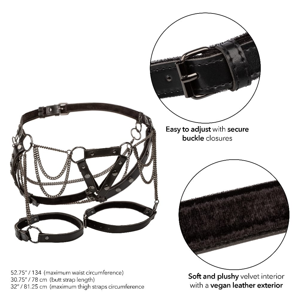 Thoughtfully crafted with adjustable waist and thigh straps, this harness ensures a secure and comfortable fit for plus-size bodies. The buckle closures are easy to manipulate, allowing you to tailor the harness to your unique shape and size. This customizability not only enhances comfort but also amplifies the harness’s visual appeal, as the chains drape elegantly, accentuating curves with every movement.