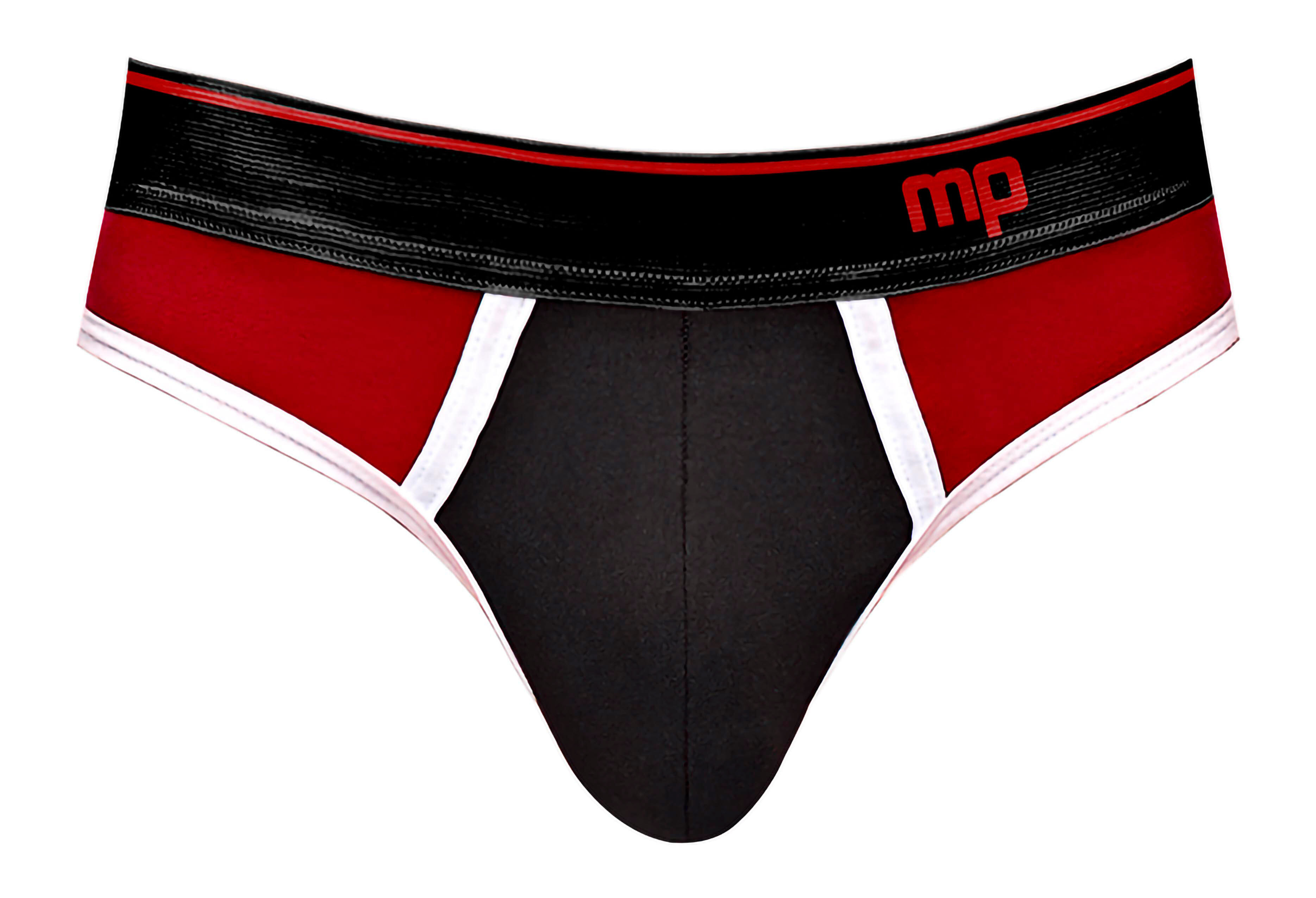 From the Retro Sport collection by Male Power, this style includes: A panel thong with color blocked fabric inserts, with white trim and stripes, and a plush elastic waist band with MP logo.