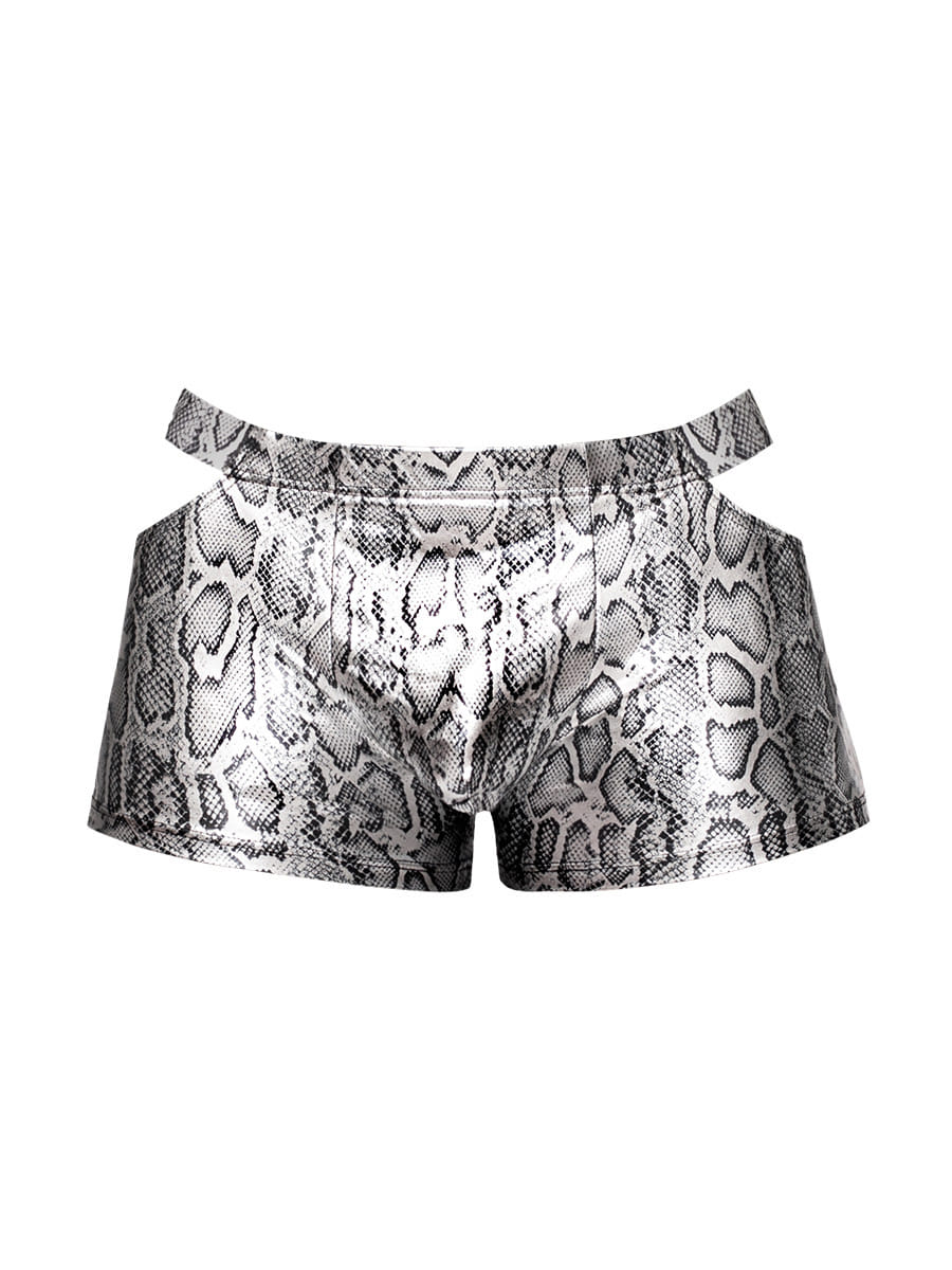 Discover the SNaked Pouch Short and experience an eye-catching look with a sleek, snug fit. This mens pouch short features a cut out window and a unique metallic snake print, giving you an edgy style that wont go unnoticed. Get amazing support from the pouch while still rocking a sleek silhouette. But the best part? This pair of undies is soft to the touch, with a luxurious snakeskin feel. Snakeskin for your skin how wild!